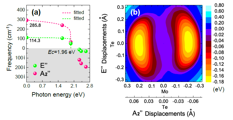 图 1 (a) E''以及A2''模式的声子频率随着激光激发态能量的变化。(b)二维势能面,其中横轴代表A2''模式下的约化位移,纵轴代表E''模式下的约化位移,等高线代表能量增量。