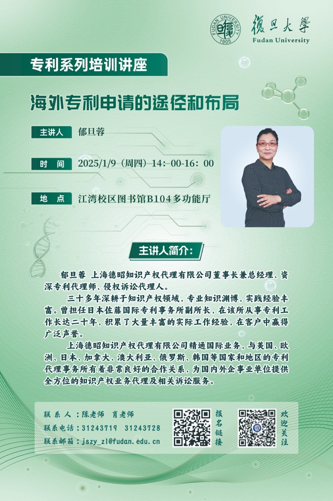 科研院技术转移中心将于与1/9(周四)14:00-16:00由主办笔趣閣 专利系列培训讲座-海外专利申请的途径和布局,讲座地点为江湾校区图书馆B104多功能厅,请感兴趣的老师扫描海报中二维码报名。