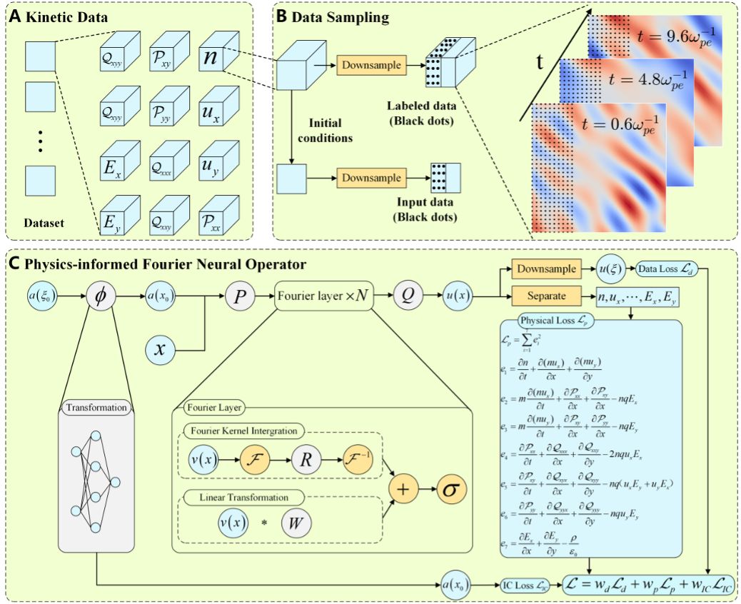 基于课题组在符号回归、物理信息神经网络(PINN)和神经算子(FNO)等方向的前期研究[1–3],本研究针对传统模型在泛化性与物理一致性方面的不足,在PIFNO框架中引入多矩磁流体方程,将连续方程、动量方程等物理约束融入损失函数,使模型在稀疏数据条件下即可准确再现朗道阻尼等关键物理过程。研究结果表明,PIFNO能够同时精确预测密度、速度、压力张量、三阶热流及电场等关键物理量;相比经典的Hammett–Perkins闭合模型[4],更能再现朗道阻尼过程;在相同尺度下,其推理速度较全动理学模拟提升约1000倍。此外,物理约束的引入有效抑制了长时演化中的涡量结构偏移与能量传输误差,并显著降低了对大规模训练数据的依赖。