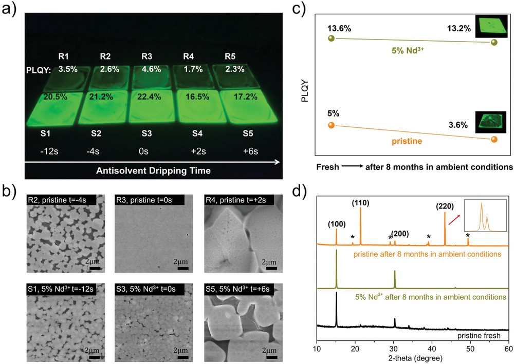 The Nd3+ doping can effectively improve the crystallinity, suppress Pb atoms and reduce defects and pinholes, therefore contributing to a 6-fold enhancement of film PLQY and an excellent stability of 8 months in ambient conditions. This strategy paves the way towards large-scale production of perovskite thin films with higher yield and better stability.