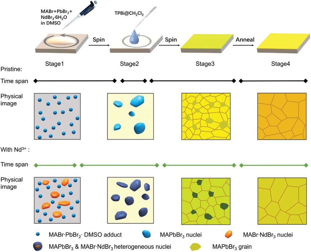 Zhang’s group also analyzed the doping mechanism, revealing that the Nd3+ induced heterogeneous nucleation leads to improved crystallization of MAPbBr3 and contributes to the ultra-wide process window, which provides a new perspective for the study of rare earth doped perovskites.
